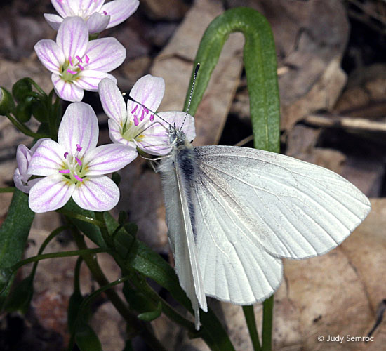 The West Virginia White butterfly (Pieris virginiensis) is a small, white butterfly found in wooded habitats of the northeastern United States. The adult butterfly, which flies only in April and May, relies on spring wildflowers, such as toothwort, trillium, and violets, for its survival. Currently there are many threats to the natural areas where the butterfly and these wildflowers are found. These threats include forest fragmentation, deer overpopulation, and the spread of invasive species, such as garlic mustard. The butterfly is just one of the native residents of the forest that will be affected if we lose our natural areas and these spring wildflowers.